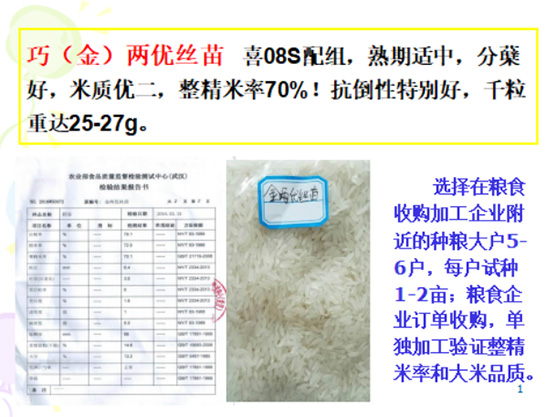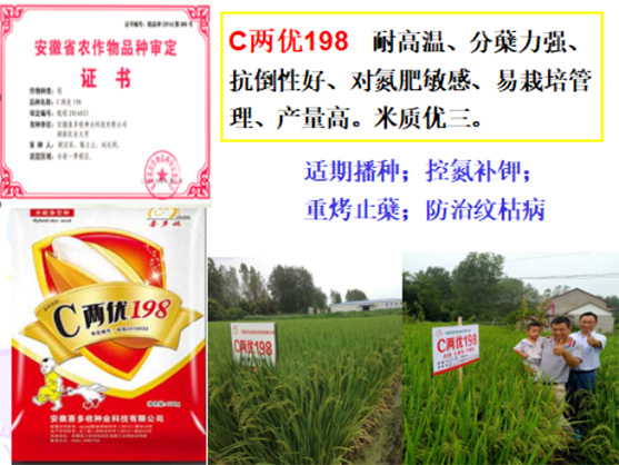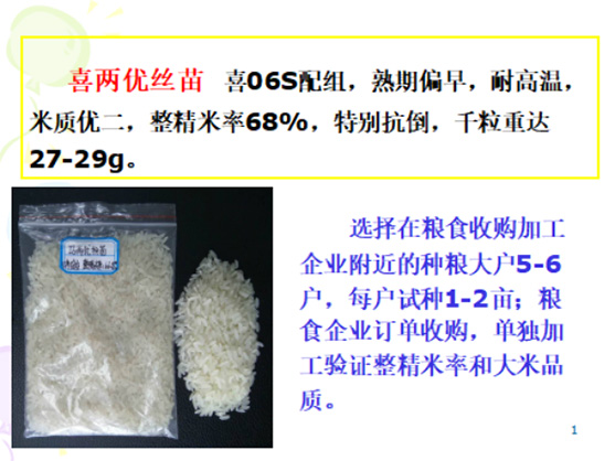 會上,六安市綠色發(fā)展研究會研究員王林,著重介紹了安徽喜多收公司為配合裕安區(qū)專用品牌糧食生產(chǎn)而精心挑選的、由公司自主培育的“C兩優(yōu)198”、“深兩優(yōu)571”、“喜兩優(yōu)絲苗”、“巧兩優(yōu)絲苗”四個雜交水稻新品種。針對這四個品種所具有的抗倒伏、耐高溫、抗病蟲、高產(chǎn)量、米質(zhì)優(yōu)、整精米率等特征特性,配套的栽培管理技術(shù)要點,與專用品牌糧食生產(chǎn)示范項目配合計劃安排等問題作出簡明扼要的闡述。得到了與會各方的認知認同。