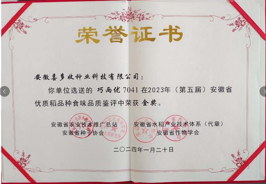 2021年通過安徽省審定品種,鄂、豫贛、  閩引種,2023年(第五屆)安徽省優(yōu)質(zhì)稻品種食味品質(zhì)鑒評(píng)中榮獲金獎(jiǎng),巧兩優(yōu)7041米質(zhì)優(yōu)二、香型、長寬比3.8、整精米率高、株型適中、抗倒伏.