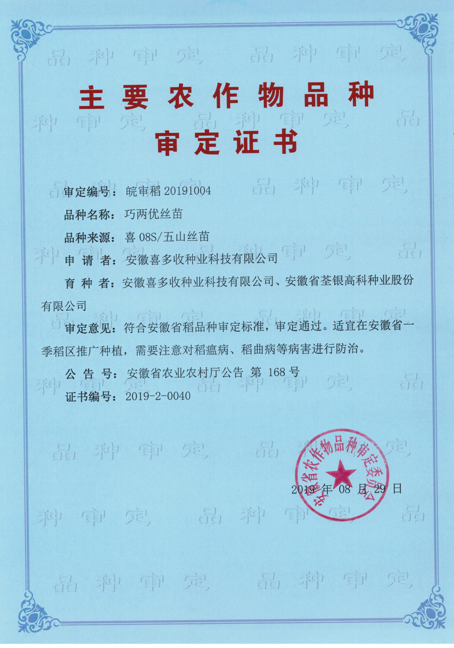 巧雙優(yōu)絲苗審定證書