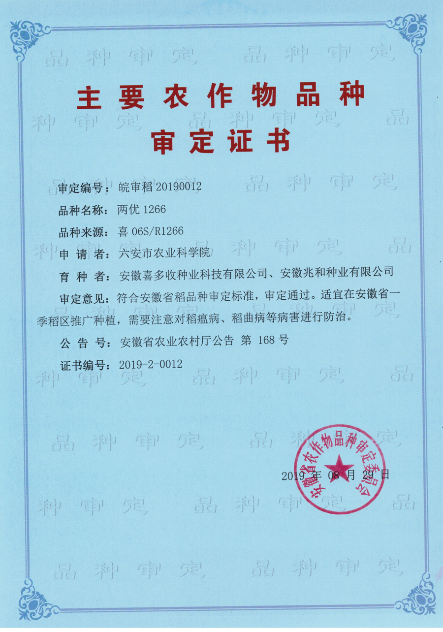 兩優(yōu)1266審定證書(shū)