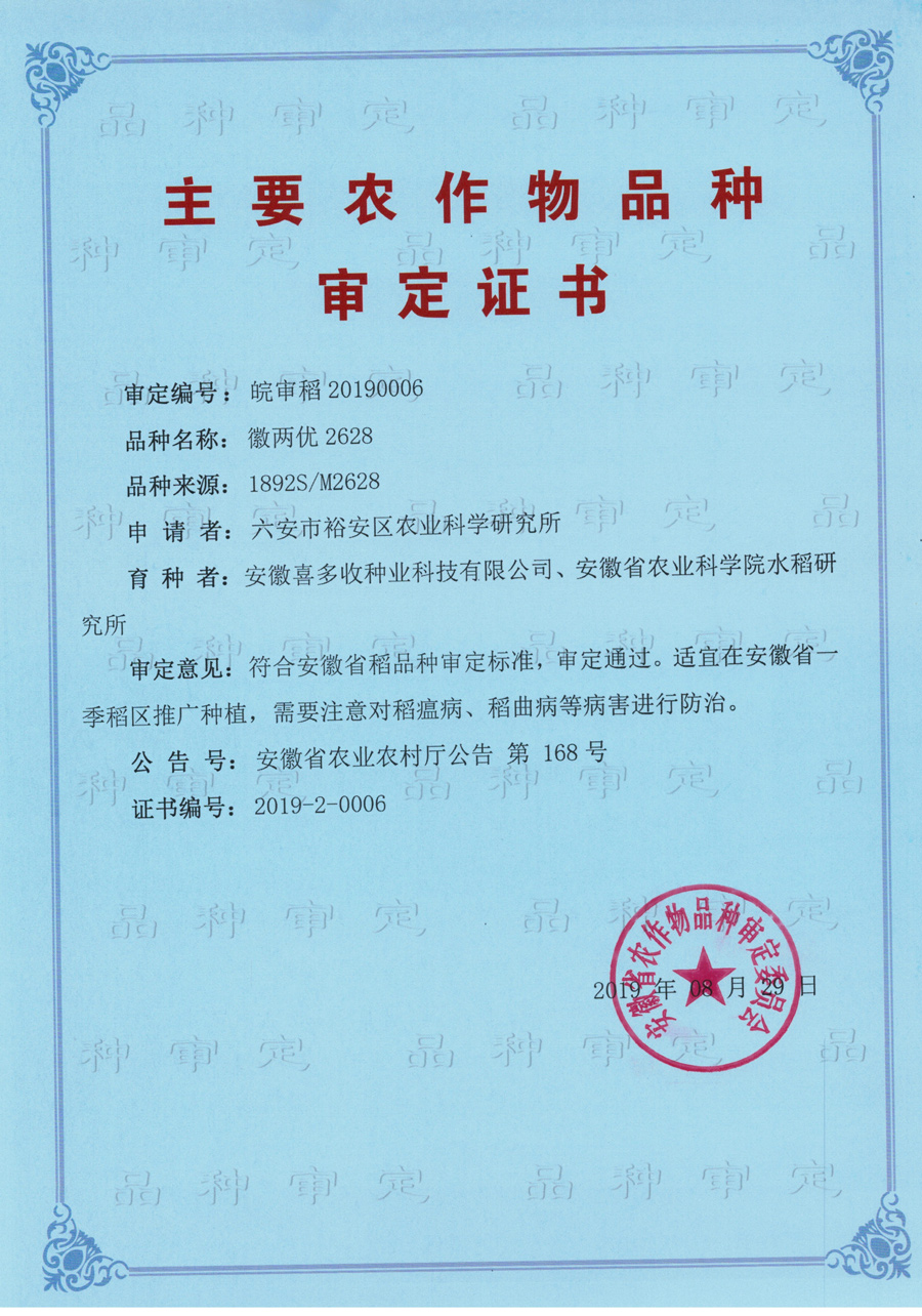 徽兩優(yōu)2628審定證書