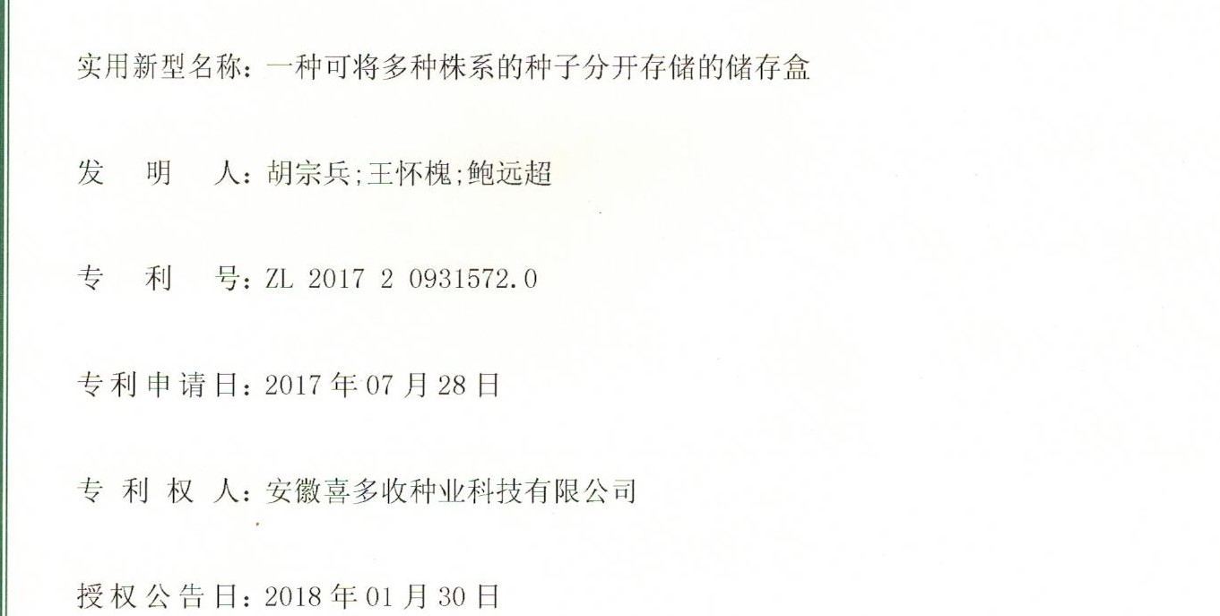 實(shí)用新型專利《一種可將多種株系的種子分開存儲(chǔ)的儲(chǔ)存盒》授權(quán)證書